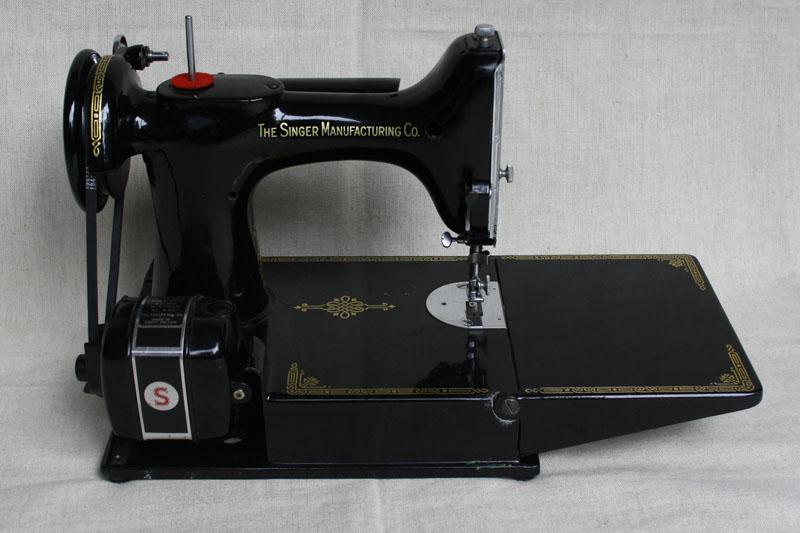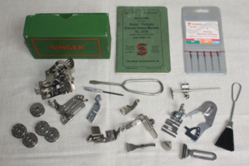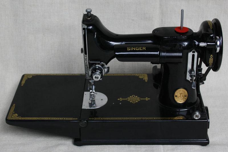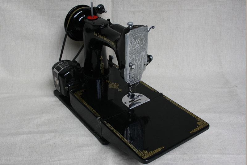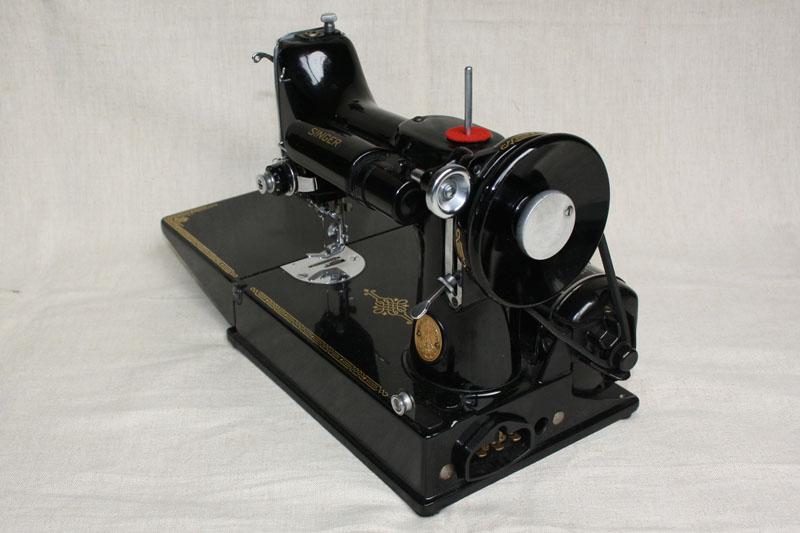 This lovely Singer 221K Featherweight was made in 1951. It is in particularly good condition with no visible wear to the gold decals and no chips or deep scratches in the Japanned surface. The normal pin scratches on the bed are much fewer and lighter than usual for a machine of this age. All the plated parts are bright and shiny with no corrosion or tarnishing.